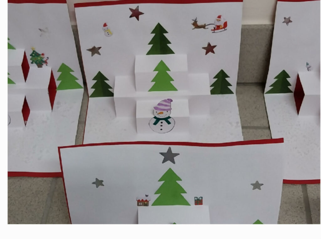 Cette année, pour donner encore plus de relief aux fêtes de Noël, les CM2 ont réalisé une carte Pop-Up en 3D !